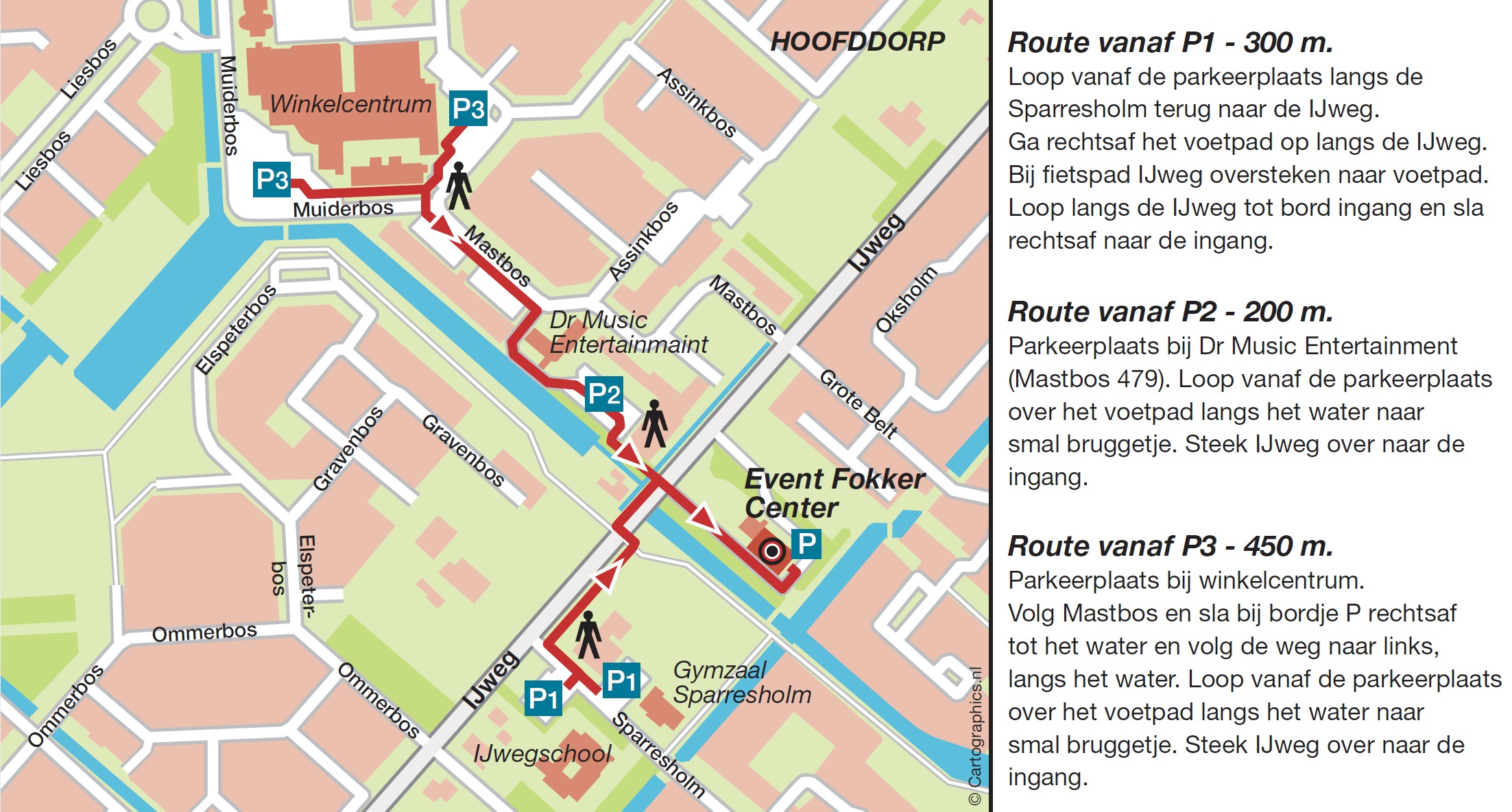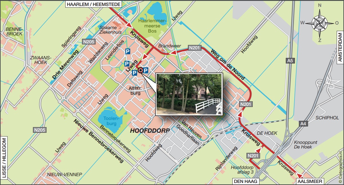 Volg de richting Hoofddorp onder rijksweg A4 door. Volg vanaf industrieterrein De Hoek de N201 (Weg om de Noord) richting Haarlem/Heemstede. Sla na de brandweerkazerne linksaf (IJweg). Volg deze weg en neem de derde afslag links tot de parkeerplaats naast onze locatie (IJweg 1094). Voor een alternatieve parkeerplaats volg de IJweg en neem de vierde afslag (IJweg 1100).